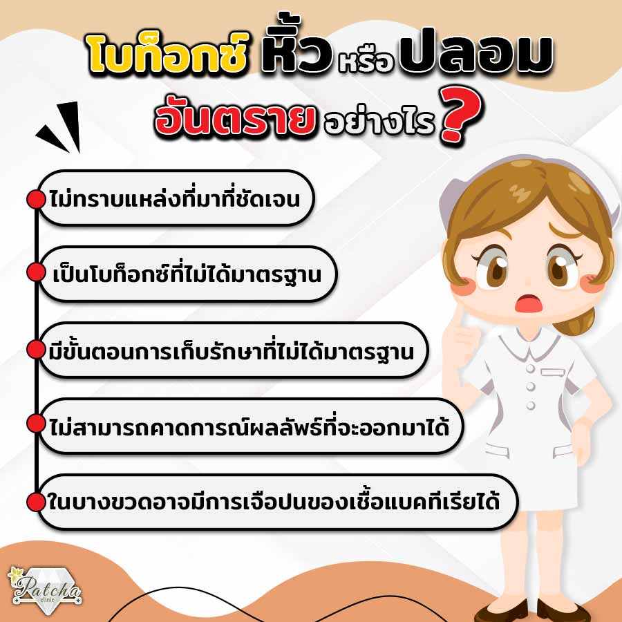 • การใช้โบท็อกซ์ที่ไม่ได้คุณภาพหรือโบท็อกซ์ปลอม ตรวจสอบผลิตภัณฑ์ก่อนฉีดเพื่อให้มั่นใจได้ว่าโบท็อกซ์เป็นของแท้ที่ได้คุณภาพ