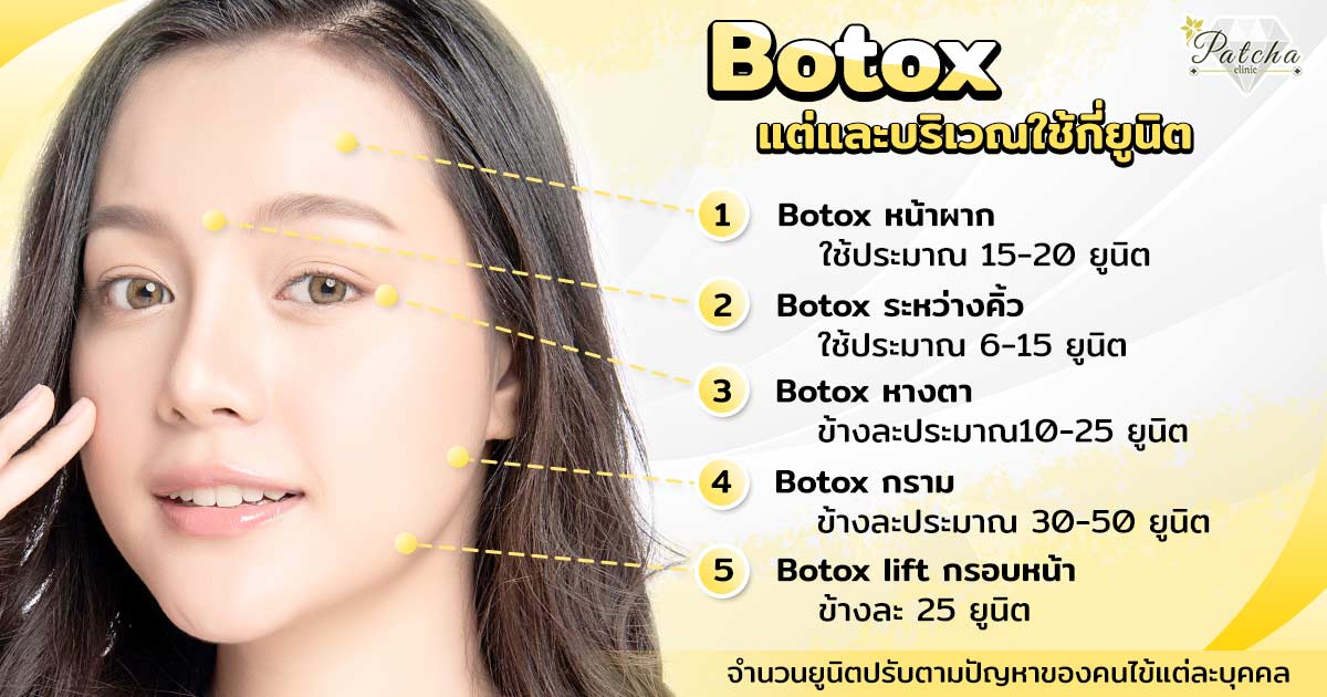 การฉีดโบท็อกซ์ในแต่ละตำแหน่งจะใช้โบท็อกซ์ในปริมาณที่ไม่เท่ากัน ขึ้นอยู่กับรูปหน้า ปัญหาที่ต้องการแก้ไข และการประเมินในแต่ละตำแหน่งของแพทย์ผู้เชี่ยวชาญเป็นหลัก แต่จำนวนยูนิตในใช้โบท็อกซ์แต่ละจุดจะสามารถบอกได้ในปริมาณที่คร่าวๆ ดังนี้