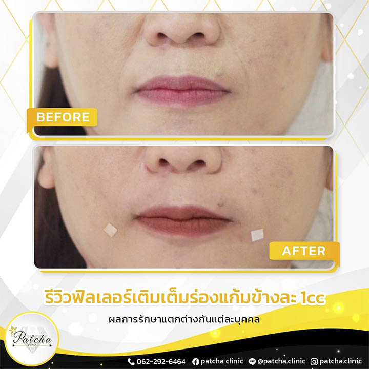 - ฟิลเลอร์ร่องแก้ม ใช้ประมาณ 1-2 cc จะทำให้ร่องแก้มดูเต็ม หน้าจะดูเด็กลง