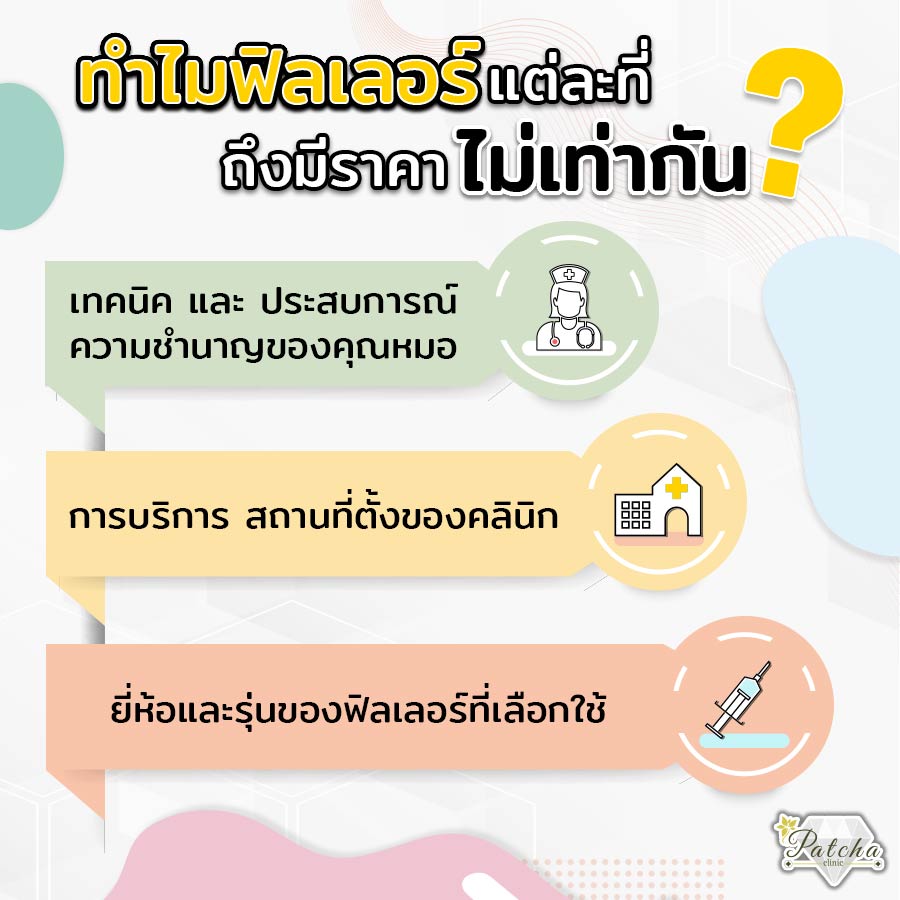 - ยี่ห้อและรุ่นของฟิลเลอร์ที่เลือกใช้ ฟิลเลอร์แต่ละตัวจะมีคุณสมบัติและเนื้อเจลที่แตกต่างกันไป และแต่ละรุ่นสามารถใช้เติมในบริเวณที่ต่างกัน มีระยะเวลาการใช้งานที่ต่างกัน ทำให้ฟิลเลอร์แต่ละรุ่นมีราคาแตกต่างกันออกไป