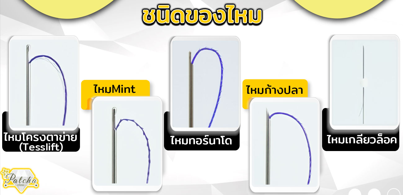 ไหมที่ใช้ในการยกกระชับใบหน้านั้นสามารถแบ่งประเภทของเส้นไหมได้ 2 ประเภทด้วยกันคือ ไหมไม่ละลาย (ไหมถาวร) กับไหมละลาย โดยที่พัชชาคลินิกจะใช้เป็นไหมละลาย สามารถสลายได้เองตามธรรมชาติ ไม่เป็นอันตรายและไม่มีการตกค้าง มีทั้งแบบเรียบและแบบเงี่ยง ซึ่งจะมีไหม 5 แบบด้วยกัน